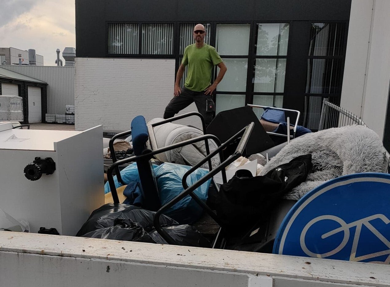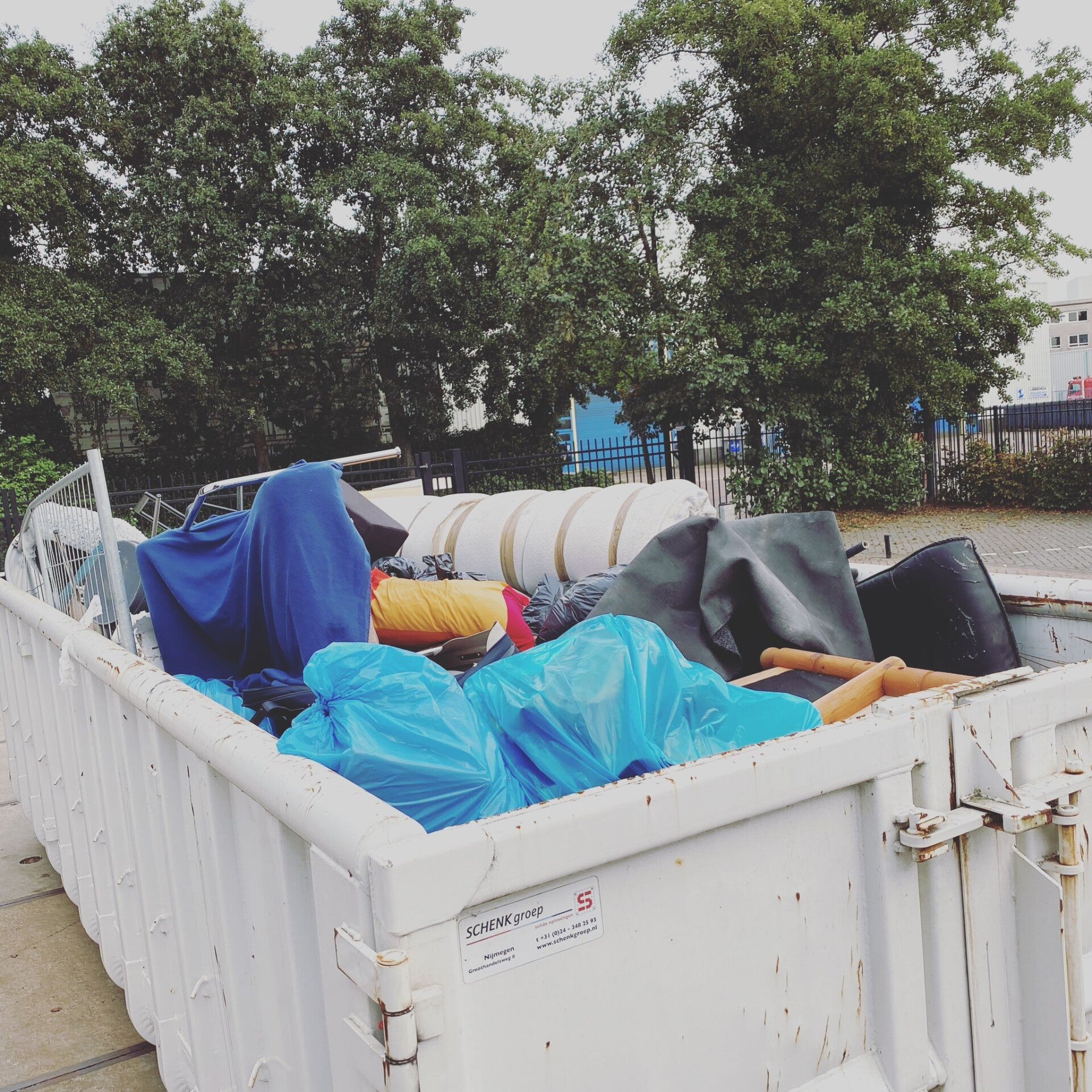 Zie hier de foto's van de gevulde afvalcontainer en Dennis Vermaas van VermiService die druk bezig is met het verzamelen van al het afval. (VermiService - Duurzame ecologische groenvoorziening)