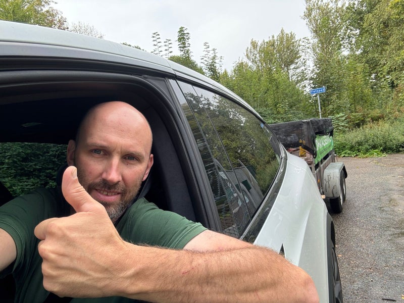 Dennis komt de zakken persoonlijk ophalen met zijn elektrische wagen.