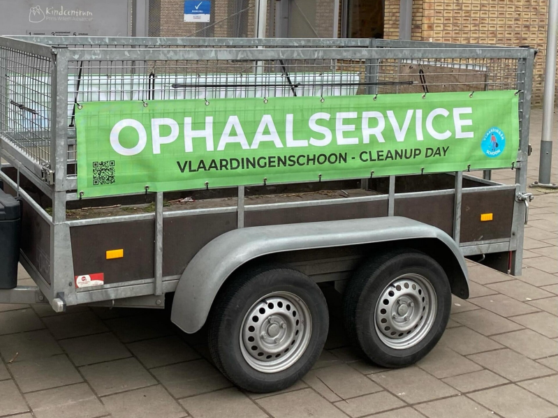 De aanhangwagen van Dennis voor het ophalen van het zwerfafval is aan weerszijden voorzien van een banner met een afmeting van 240x60 cm. Zoals te zien op de afbeelding. Dit voor de herkenbaarheid.
